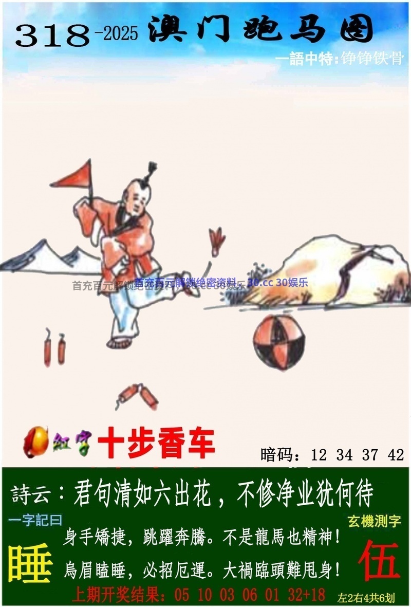 318期一字記曰:【睡】身手娇捷,跳躍奔腾,不是龙马也精神。乌眉瞌睡,必招厄运,大祸临头难甩身。《伍》 |